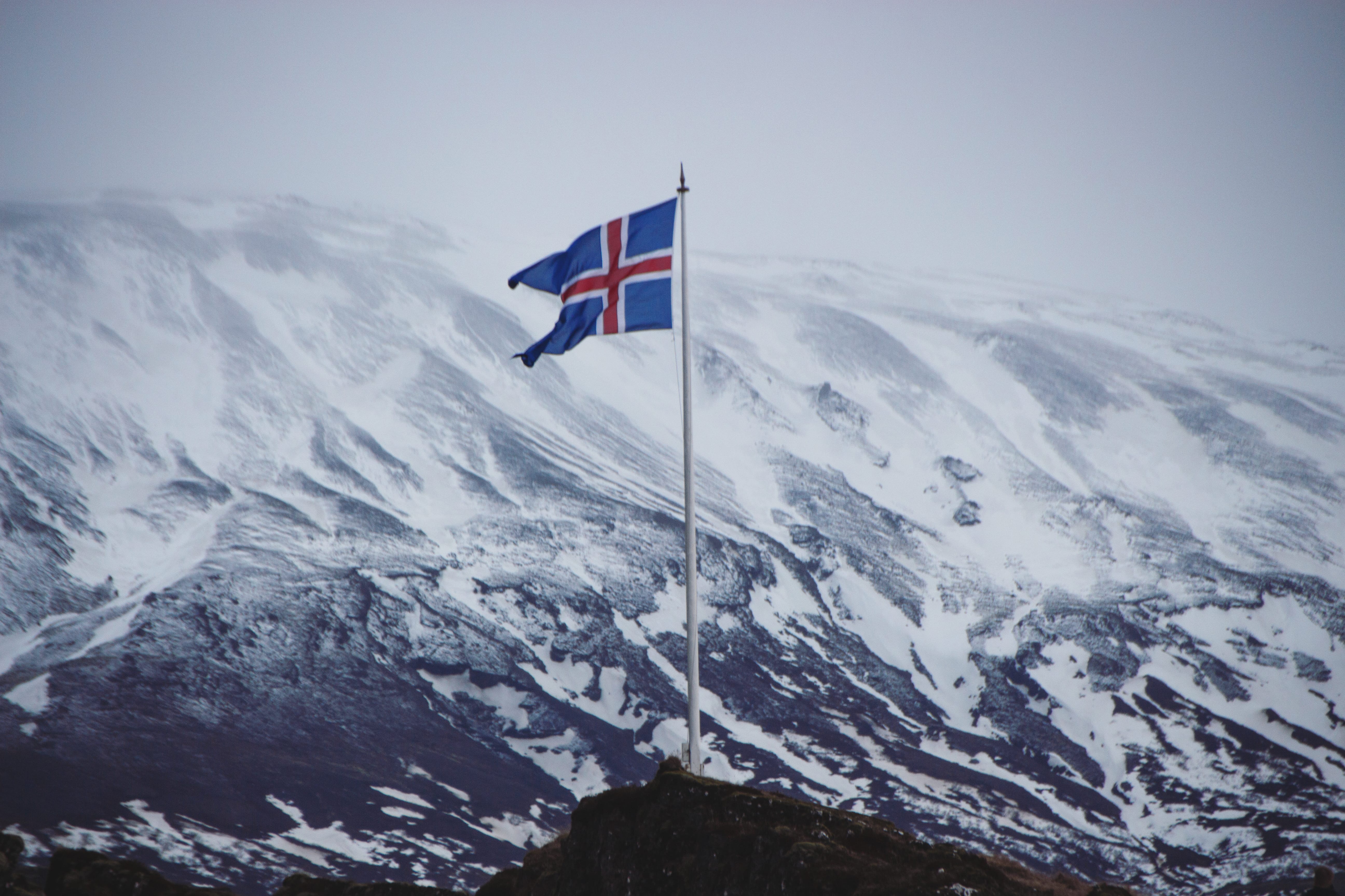 Detailed closeup view of Icelandic national flag banner symbol sign with snowy winter mountain range in background Thingvellir National Park Iceland Europe